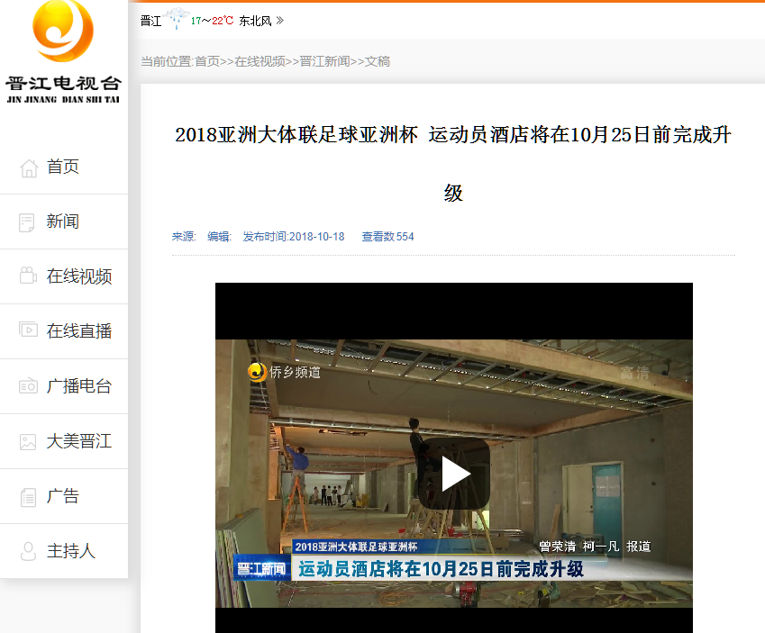 【晋江电视台】2018亚洲大体联足球亚洲杯 运动员酒店将在10月25日前完成升级