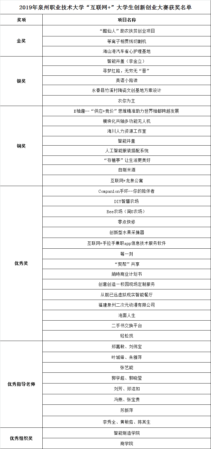 6月23日上午,2019年泉州职业技术大学“互联网+”大学生创新创业大赛决赛在338国际会议厅闭幕。经过激烈角逐,“酷仙人”助农扶贫创业项目、等离子相贯线切割机、海山港汽车省心护理基地三个项目获得本次大赛金奖。智...