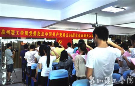 6 月11日上午,泉州理工学院举行纪念中国共产党成立90周年暨新党员入党宣誓大会,115名新党员面对党旗庄严宣誓。出席会议的领导有苏志明校长、庄文瑞副校长、吴滨如副书记、苏白茹副书记、党委委员刘兆麟、陈其生等...