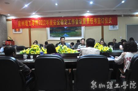 4月25日下午,泉州理工学院于思恩楼一楼会议室召开2012年安全工作会议暨责任书签订仪式。会上同时对2011年度基层安全稳定工作先进集体和个人给予表彰。 会上,庄文瑞副校长分别从领导问责,上级指示传达,学生...