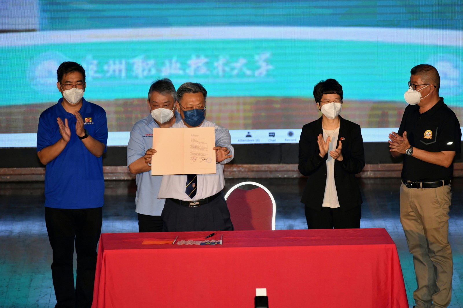 中国侨联副主席、福建省侨联主席陈式海、福建省侨联文化交流部部长齐志、福建省侨联文化交流部四级调研员 陈育良、泉州市侨联主席温锦辉、泉州市侨联文联部部长许锦龙、晋江市委常委、统战部部长黄天凯、晋江市侨联主席 陈建军、晋江市侨联办公室主任蔡婉婷、泉州职业技术大学党委书记傅志雄、校侨联主席、党委委员、副校长姚丹、校侨联副主席、党委副书记、副校长蔡金佩、对外合作交流处副处长王寰等出席。同时,中国驻哥打基纳巴卢总领事黄世芳、沙巴马中联谊协会会长胡逸山、亚庇建国中学董事长叶参、校长吴德成、沙巴马中联谊会常务副会长兼秘书长廖志国等出席马方现场。