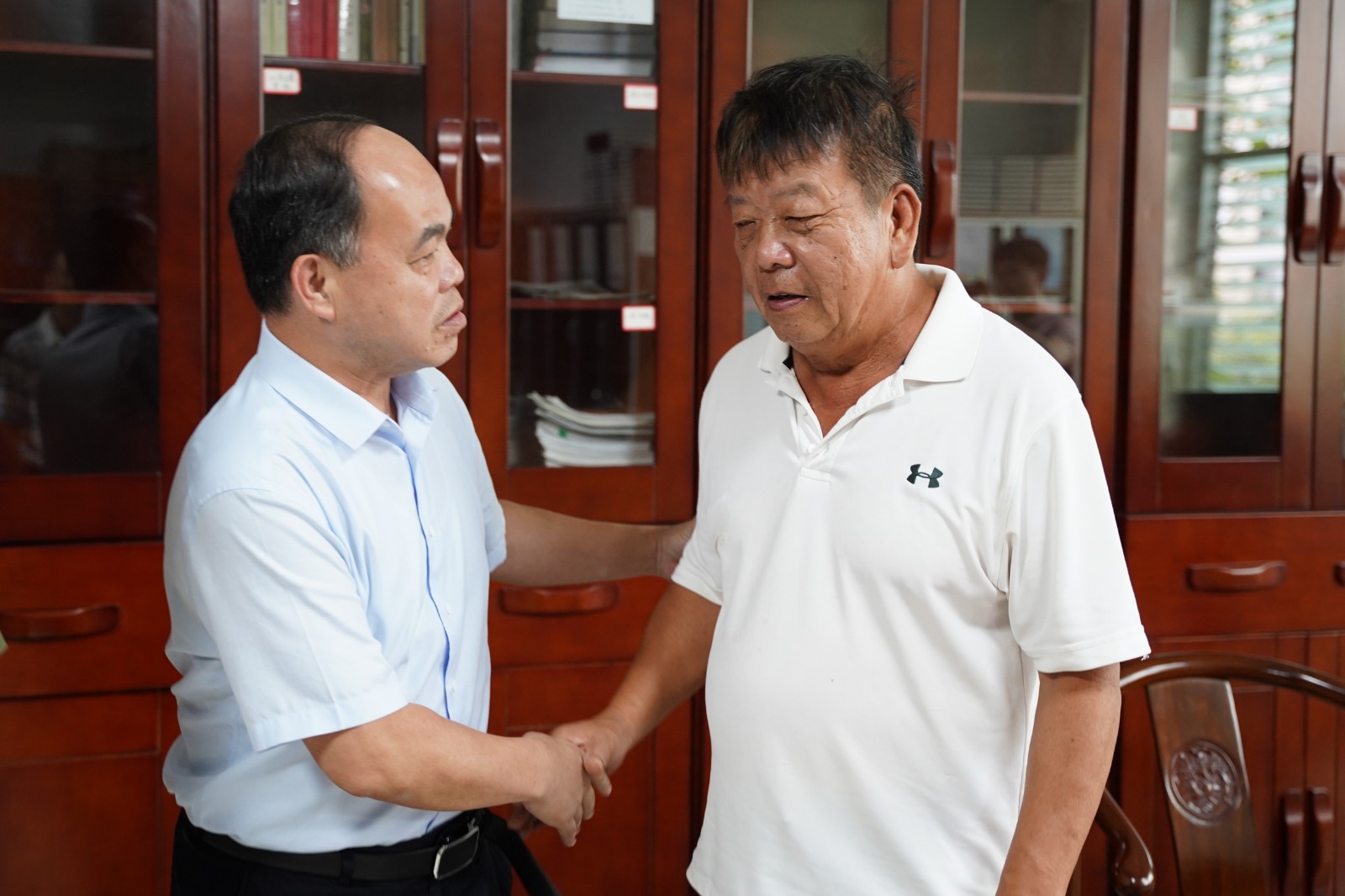 在董事长的办公室内,方彦国巡视员询问吴金营董事长身体、生活和工作情况,倾听他在烽火岁月中的英雄事迹,赞扬其退伍后创业公益办学的壮举和善举,“吴金营同志非常了不起”。