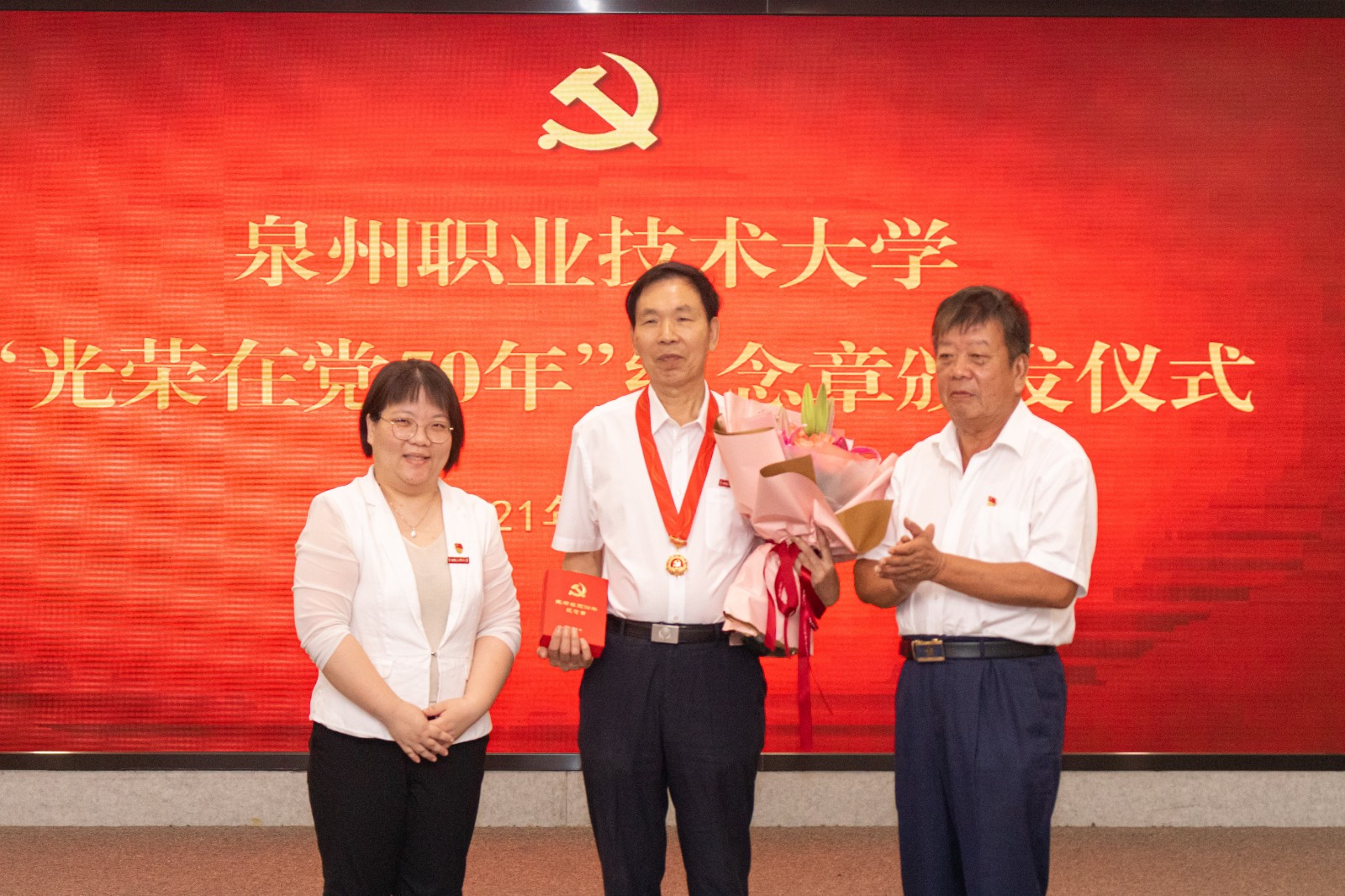 7月1日上午,我校隆重举行“光荣在党50年”纪念章颁发仪式,及时将党中央的关怀和温暖传递给老党员,让他们在建党百年之际真切感受崇高的政治荣光。仪式由校党委书记傅志雄主持,获颁纪念章的老党员、学校中层以上党员干部、党员师生代表参加颁发仪式。