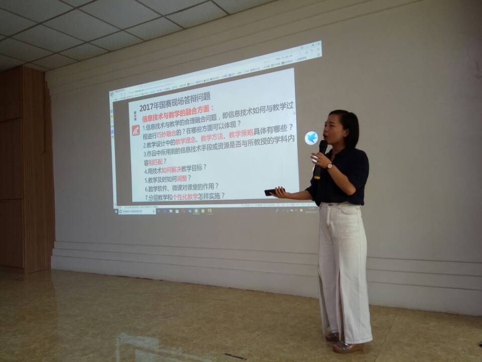培训分别从2018年全国赛制解析、信息化教学设计能力分析、案例分析(教学设计和教学课堂)三个方面进行。根据国赛现场答辩的问题,从选题方面、信息技术与教学融合方面、流程与效果方面进行针对性讲解,同时重点讲解了信息化教学设计中应该注意的事项。