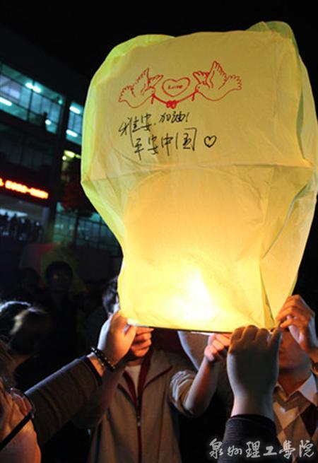 “雅安加油!中国加油!”“雅安,我们永远与你们同在!”泉州理工学院党委副书记吴滨如,副院长庄文瑞写下自己对雅安的祝愿,师生们也纷纷写上祝福语,许下祝愿,放飞孔明灯,祈祷雅安一切安好!