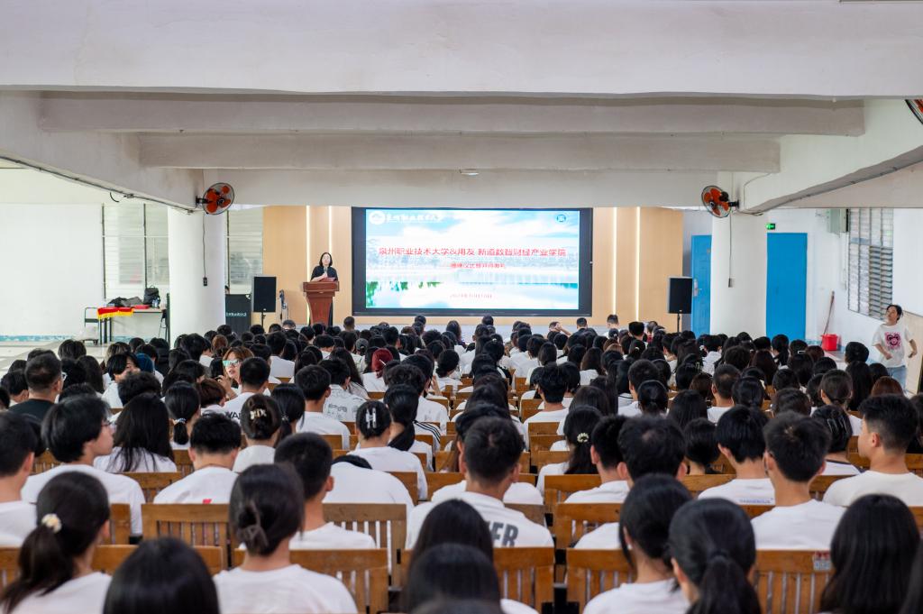 10月11日下午,泉州职业技术大学&用友|新道数智财经产业学院揭牌仪式暨开班典礼在泉大举办。出席揭牌仪式的领导、嘉宾有:新道科技股份有限公司副总裁刘莉,福建分公司总经理罗永官、副总经理陈娴等;泉州职业技术大学副校长张建军,校长助理苏康敏,商学院院长姚宏伟、党支部书记叶城锋、院长助理郭学超、大数据与财务管理专业负责人王树锋、大数据与会计专业负责人段芳明,以及大数据与财务管理和大数据与会计专业的教师和2023级、2024级全体学生。