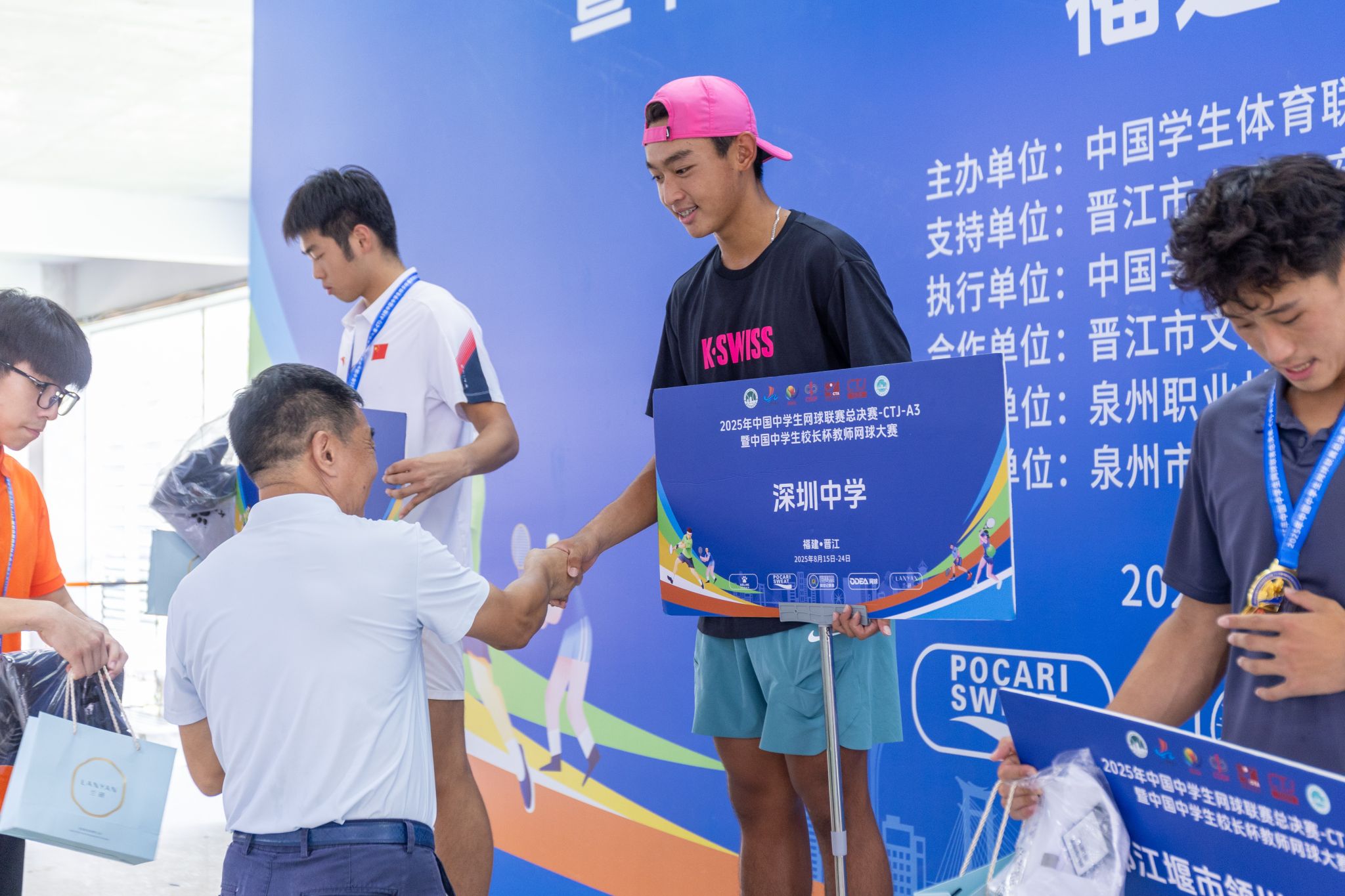 经过一周的激烈角逐,8月23日,大赛闭幕式隆重举行。中国学生体育联合会中学生网球分会秘书长曹郑,晋江市文化体育和旅游局四级调研员陈茂和,晋江市内坑镇党委组织委员、宣传委员蔡东升,泉州职业技术大学副校长林文艺,泉州市网球协会会长苏文彬,本届赛事纪律监督颜中杰,赛事监督粟辉、裁判长马立迎等领导嘉宾出席仪式。