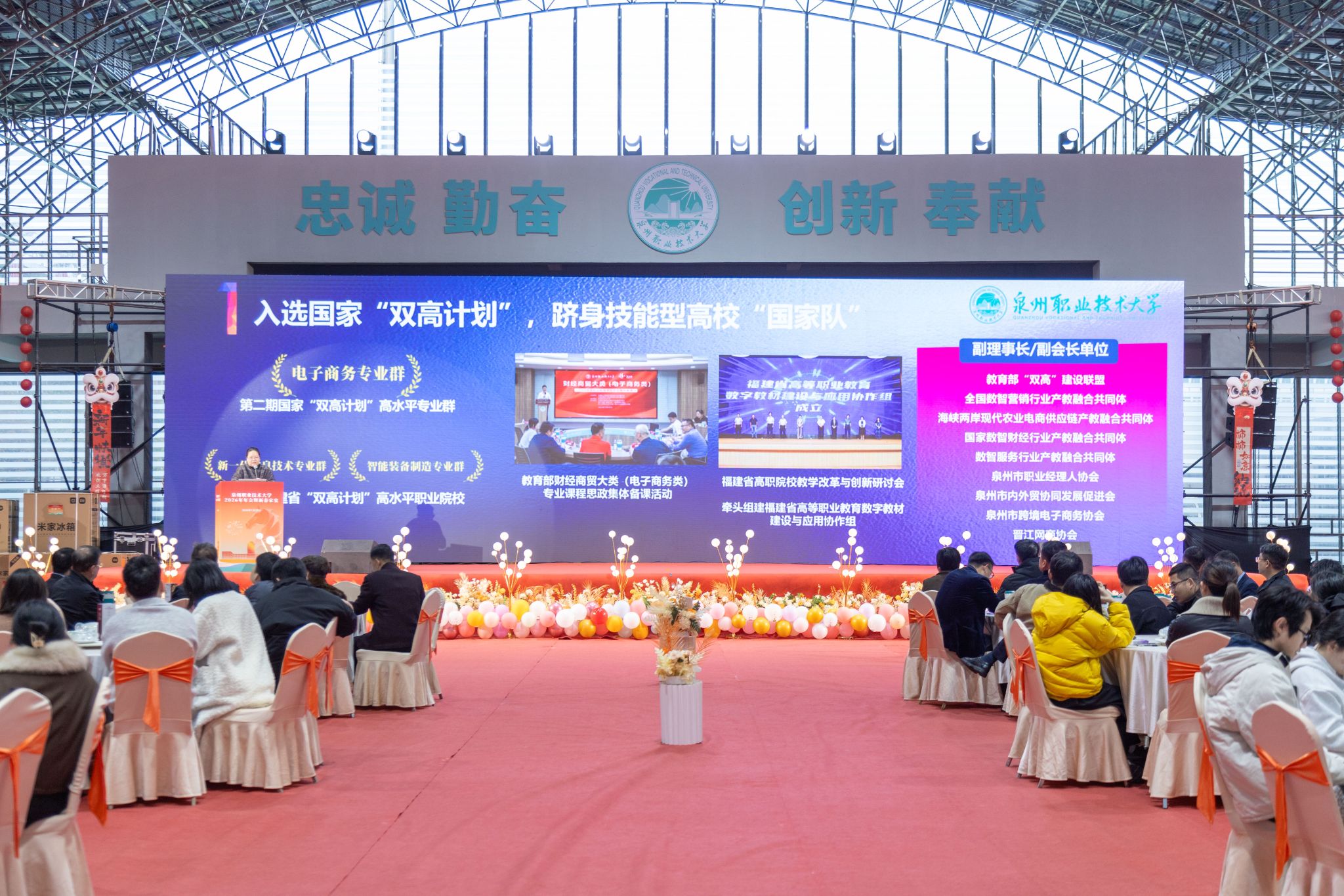 1月20日,泉州职业技术大学隆重举行2026年会。学校创办人、董事长吴金营,泉大教育基金会理事长杨培琛,校长吴滨如,党委书记傅志雄,全体校领导、教职工及产业伙伴代表、南非培训学员参加。年会由傅志雄书记主持。
