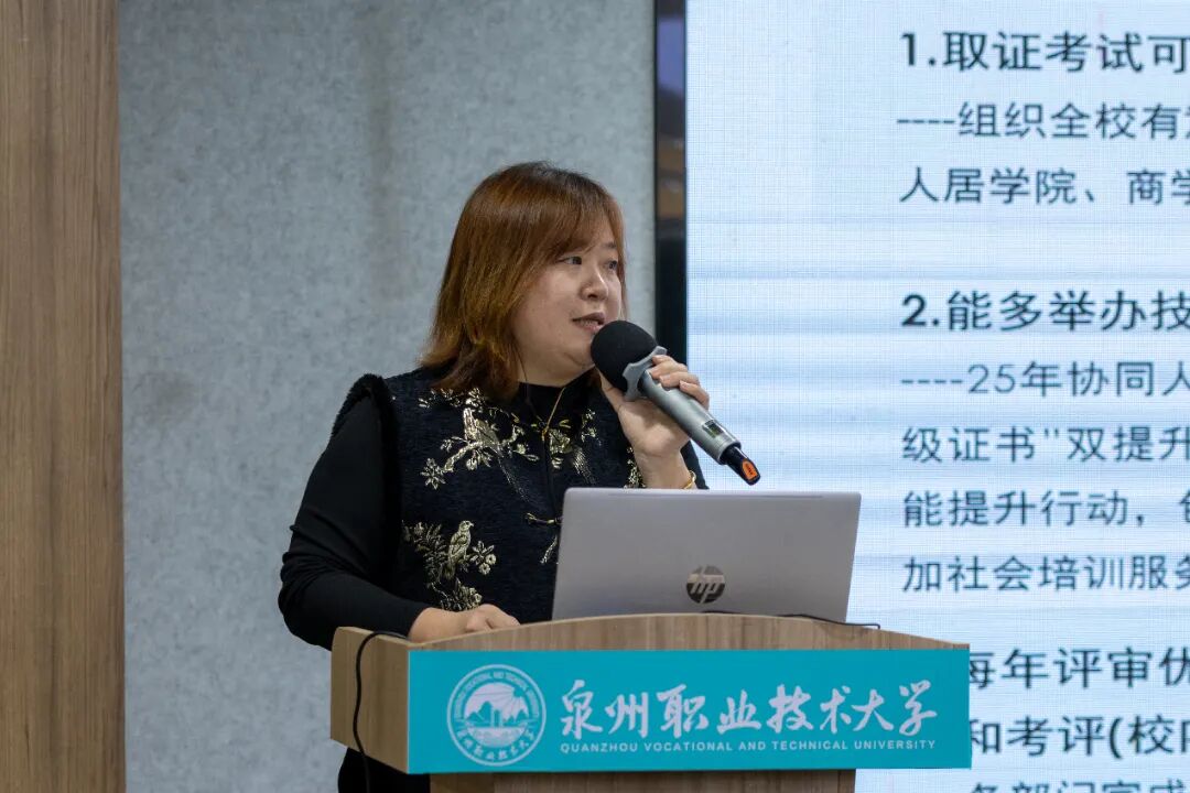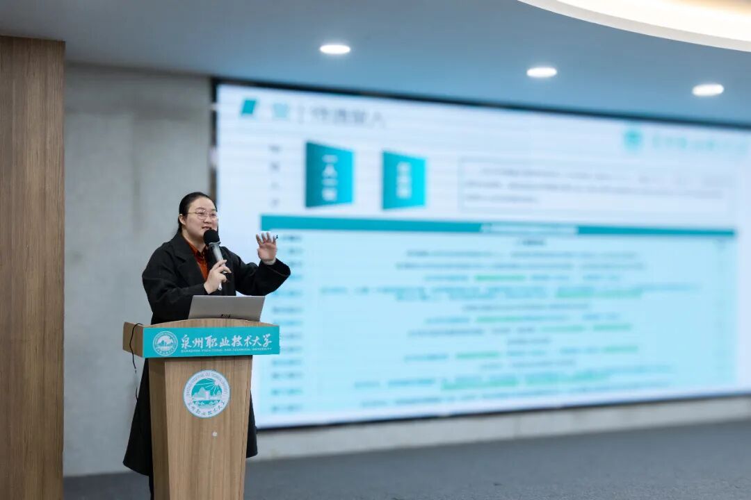 述职总结会上,吴滨如作《服务需求、深化产教城融合,提升关键办学能力》的主题报告,从“职业本科办学模式的思考”“产教城融合的探索与实践”“几点体会”三方面进行阐述,梳理学校扎根晋江、服务泉州、面向福建,主动对接服务区域产业发展和国家战略布局需求,围绕深化产教城融合,全速推进基于“产业伙伴型大学”和“市域产教联合体”双轮驱动的职业本科办学模式,推动学校高质量发展。她特别分享、解读了5个产教城融合的特色案例,分别是“以产定教”的省“双高”新一代信息技术专业群、“助产高端”的省“双高”智能装备制造专业群、“与产共荣”的国家“双高”电子商务专业群以及工艺美术专业群服务城市文旅产业、城市更新专业群服务未来城市建设,全面展示学校与城市、产业深度融合的实践探索及经验模式。