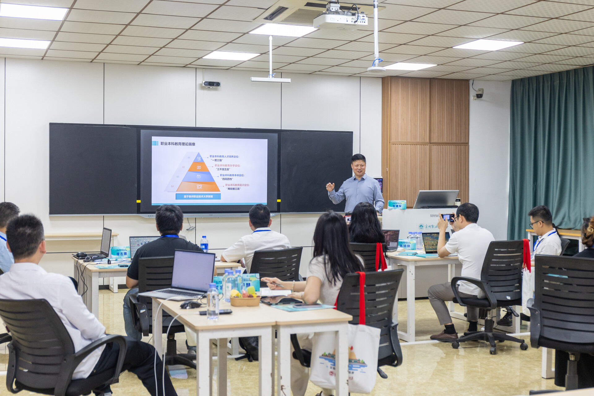 副校长张建军教授作《职业本科教学改革与课程改革》专题报告,系统阐述职业本科理论探索、办学模式创新,重点介绍学校自主研发的“543产教融合课程体系”和“3C3S教学法”,并分享职业本科质量评价的前沿思考。