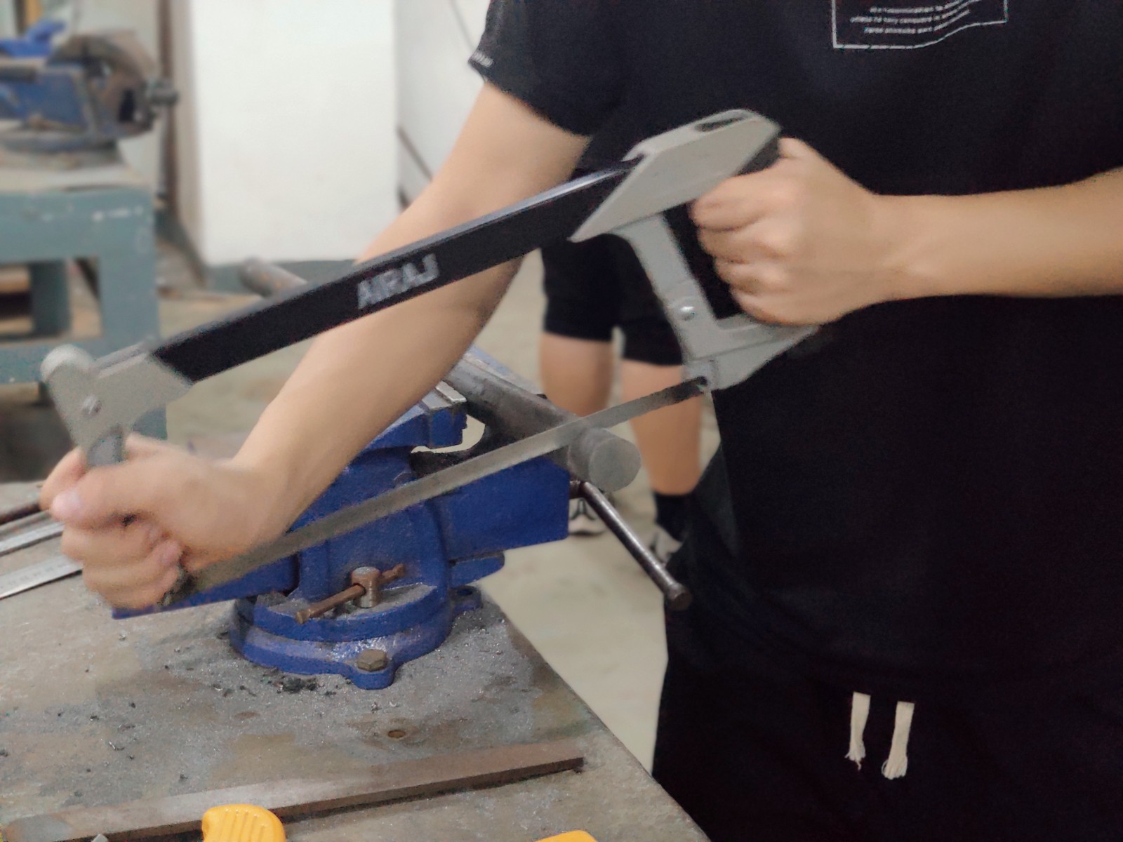 学生在进行錾、锯、锉、钻孔综合实训